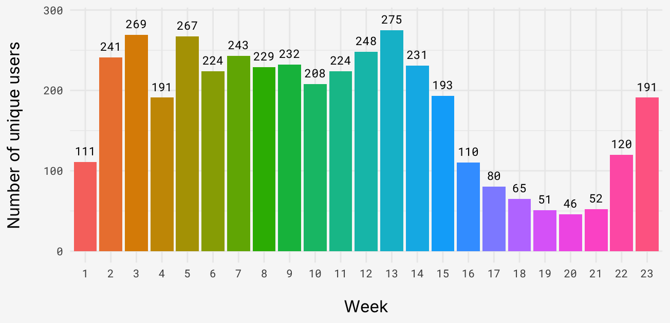 The Christmas and New Year holiday provided a natural test of this pattern. Usage dropped sharply in mid-December, falling below 100 active users for the first time since launch—down to as few as 46 users in some weeks. Then, when school resumed in January, it rebounded nearly three-fold, particularly among the teachers who had demonstrated the most intensive engagement throughout the pilot. They stopped using aprendIA when they stopped teaching, and resumed when teaching resumed.